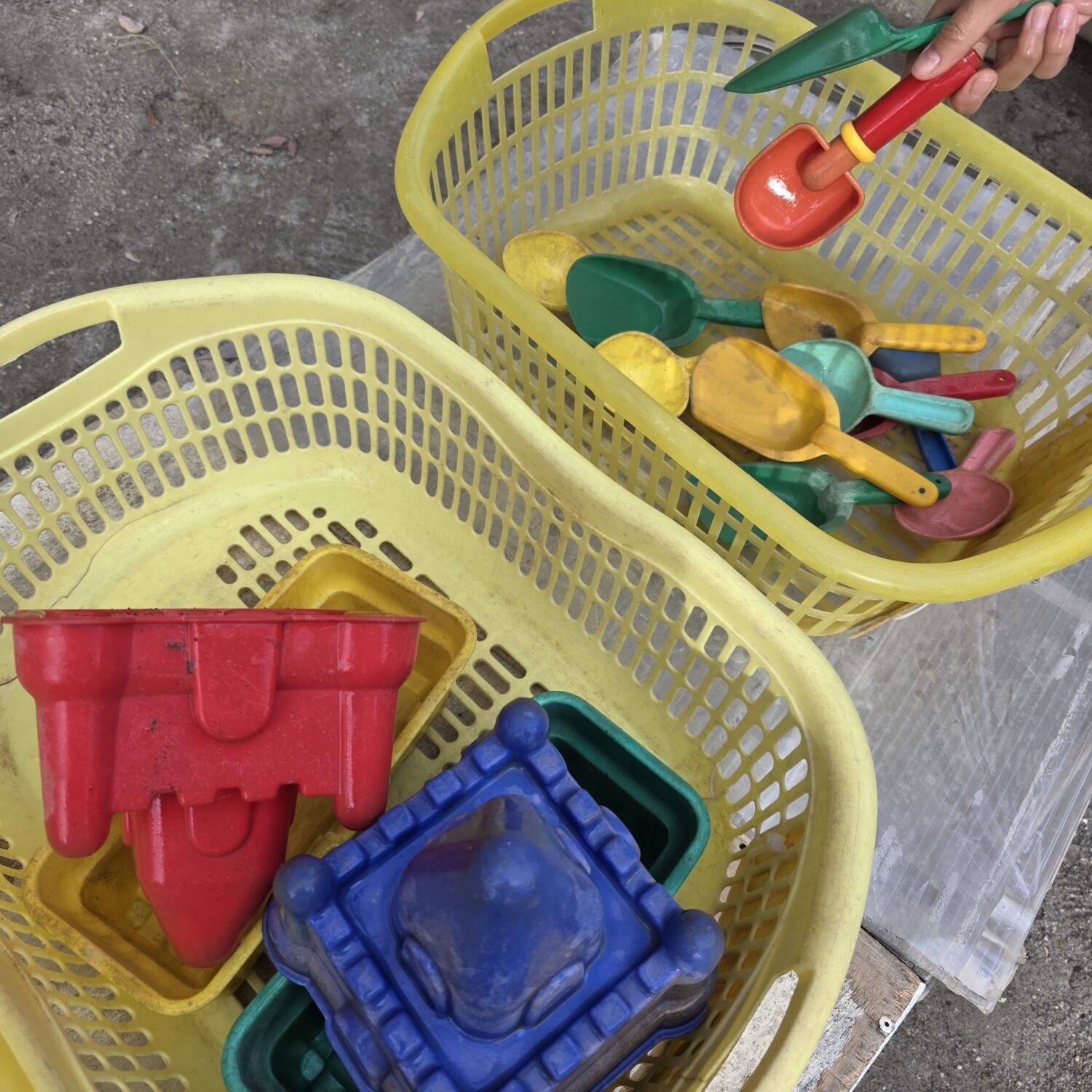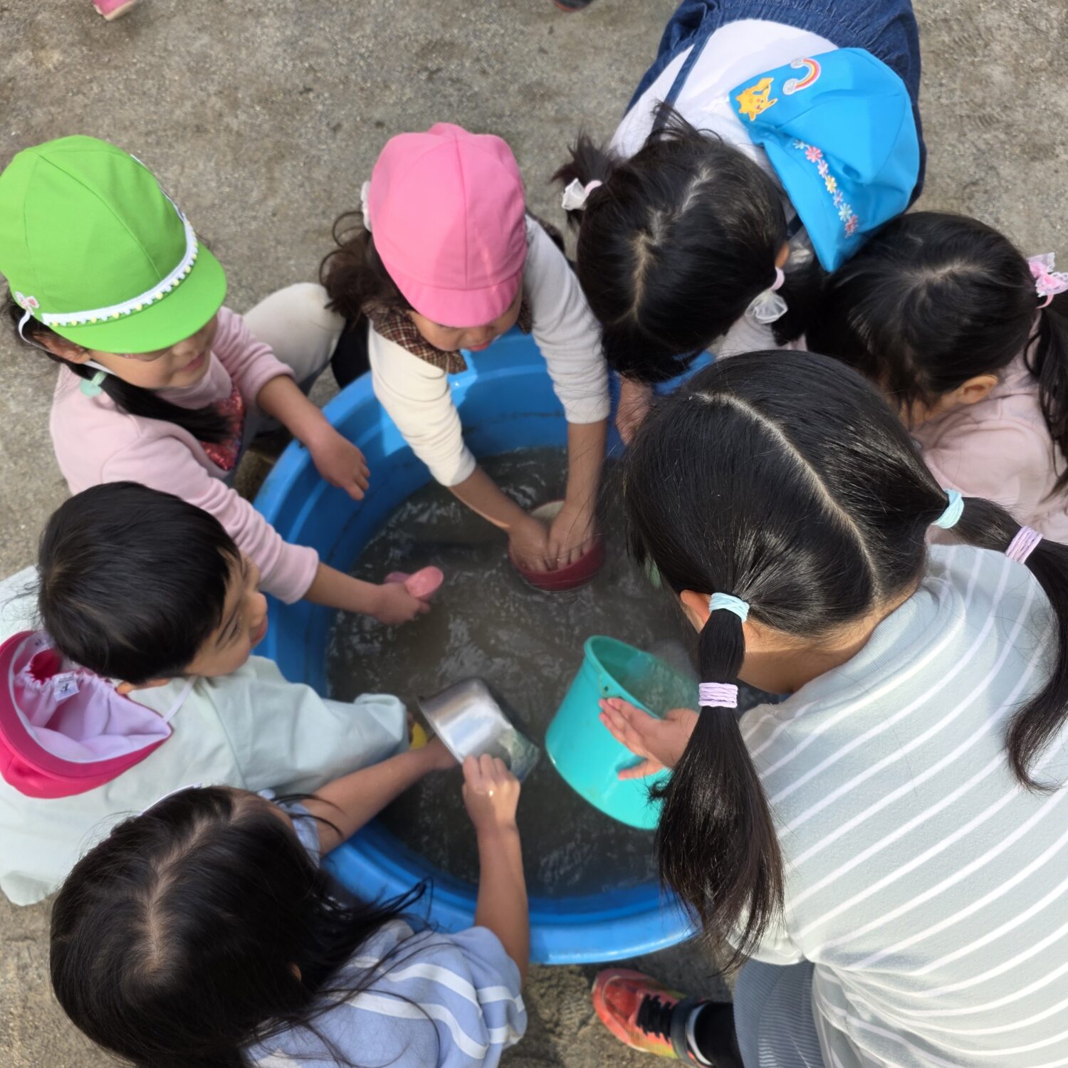 お湯をたらいに入れると、、「温泉みたい!」とお手てを温めながらお砂場道具を、丁寧に洗う姿がかわいらしい♥️