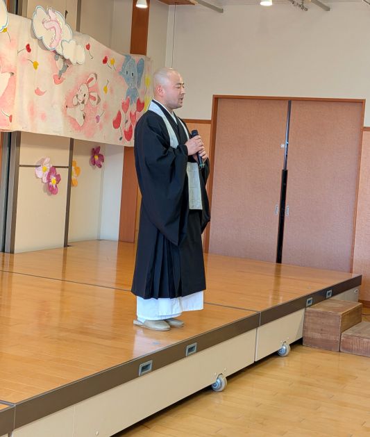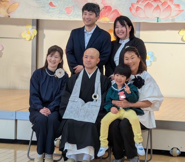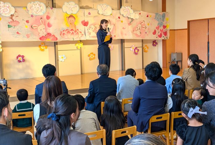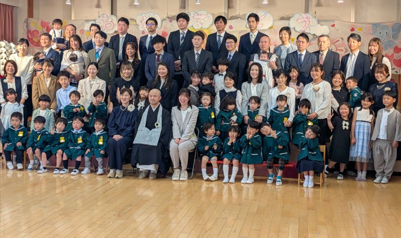 今日は幼稚園の入園式です。新理事長先生の耕先生、園長先生、たくさんの先生たち、在園生のお兄さんお姉さんみんなでお祝いをしました。