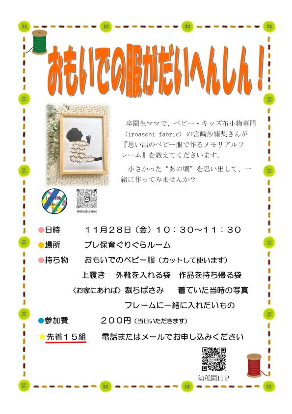 今日は一日雨という天気予報になりました。残念ですが中止とさせていただきます。 運動会や区民祭りに来てくださった皆さん、ありがとうございました。 来月の『ようちえんであそぼう!』は1・・・ -