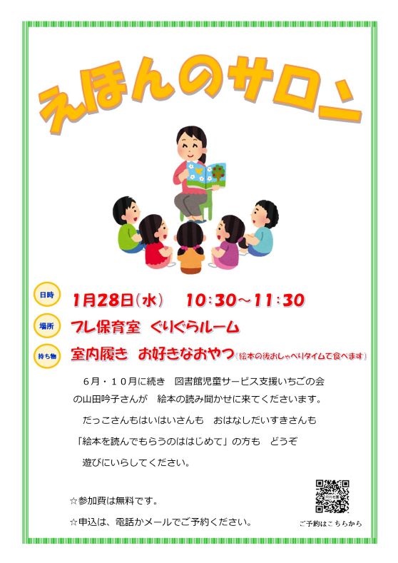サロン 9(金)えほんのサロン 28(水) 10:30~11:30 ※要予約 外靴を入れる袋をご持参ください。カーペットを引いていますが、足が寒いようでしたら上履きをお持ちください。 ・・・