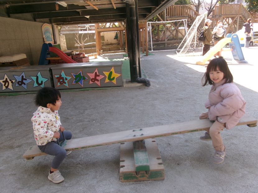 令和7年度最後の『ようちえんであそぼう』は、とても良いお天気になりました。お庭で遊ぶのを楽しみに待っていてくれたお友だちが、たくさん来てくれました。 「ち・・・
